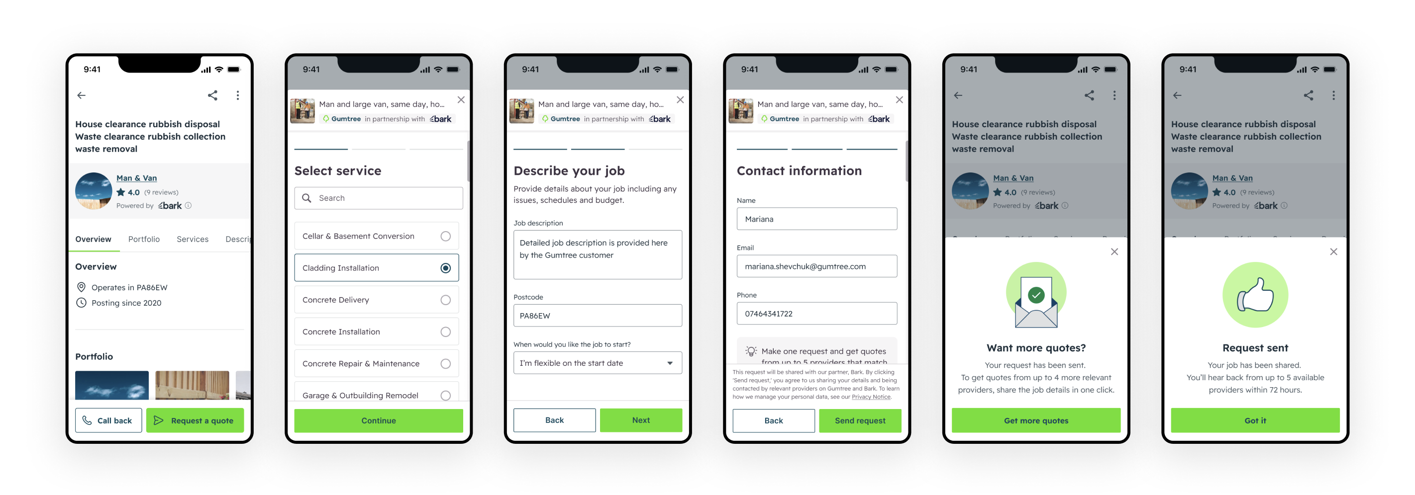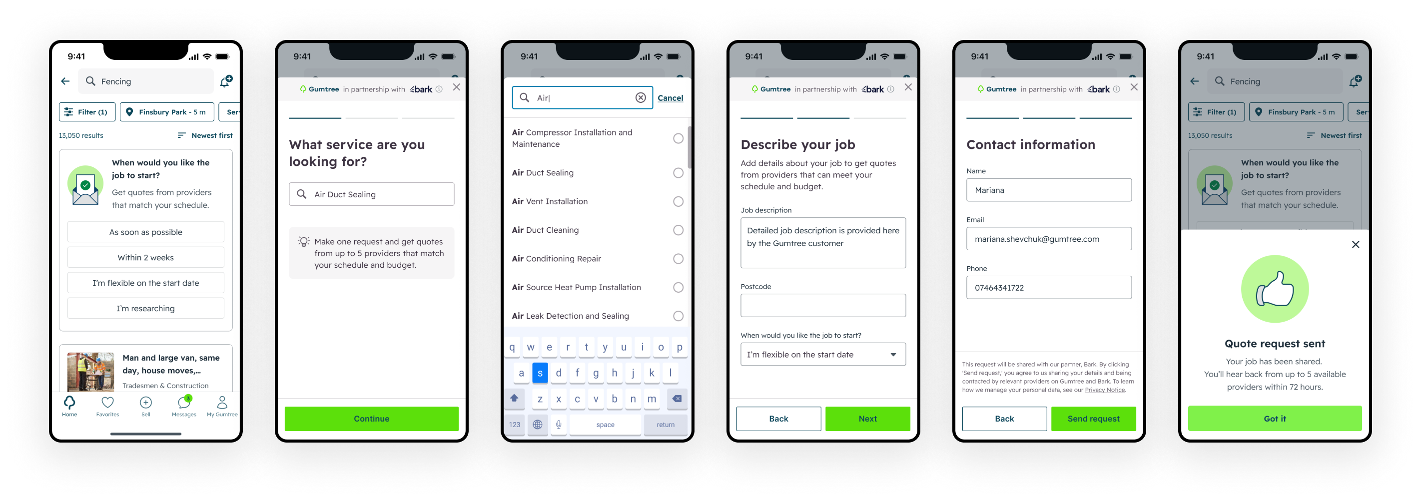 This work enabled the successful launch of the Bark partnership, connecting 10 million Gumtree users with over 30 000 verified professionals. By improving UX and balancing user needs with business and revenue goals, we created a more competitive, future-ready platform for growth and new partnerships.