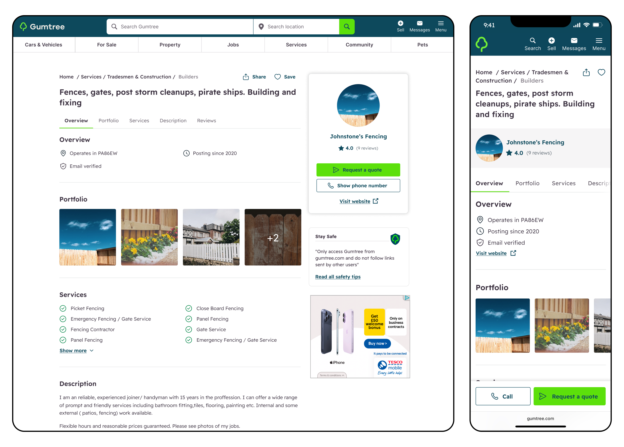 Gumtree's Services pages were inherited from 'For Sale' and did not meet the expectations of service providers or buyers. Competitors offered optimised and structured profiles, while Gumtree did not. With the Bark integration on the horizon we needed to improve Gumtree's UI to ensure consistency, enhance the user experience and avoid negative sentiment among sellers.